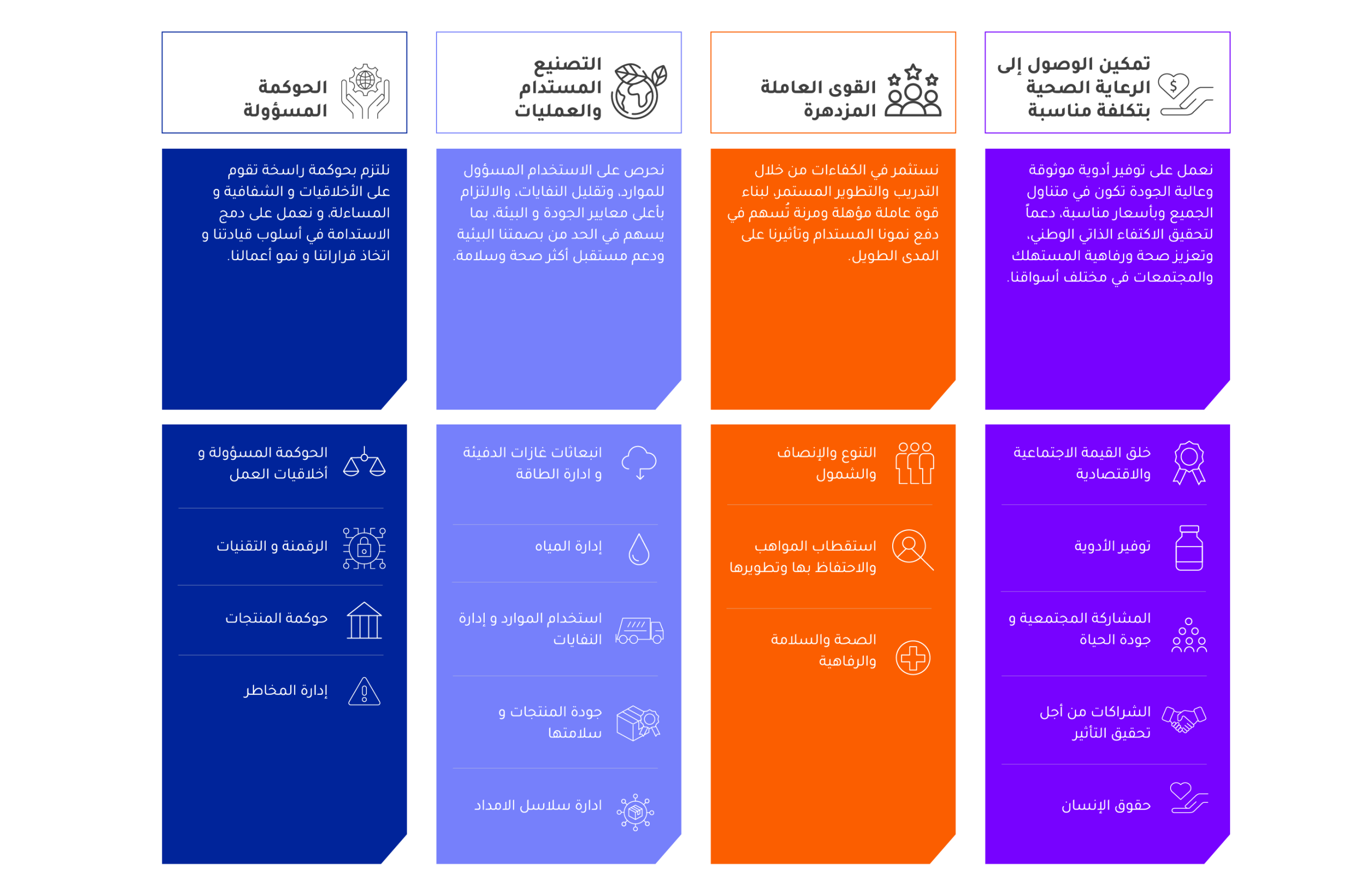في جمجوم فارما، تُشكِّلُ الاستدامةُ جزءًا لا يتجزّأُ من جميعِ الأعمالِ التي نقومُ بها، بدءًا من توسيعِ نطاقِ الوصولِ إلى الرعايةِ الصحيةِ بأسعارٍ معقولةٍ، إلى بناءِ قوّةٍ عاملةٍ مزدهرةٍ، والعملِ بمسؤوليةٍ، وتعزيزِ الحوكمةِ القويةِ، لأنَّنا نعتبِرُ إطارَ الاستدامةِ في الشركةِ ترجمةً لالتزامِنا بخلقِ قيمةٍ طويلةِ الأجلِ للمرضى والمجتمعاتِ والكوكبِ، وتعزيزِ الابتكارِ والنموِّ الأخلاقيِّ في كلِّ جزءٍ من أعمالِنا.