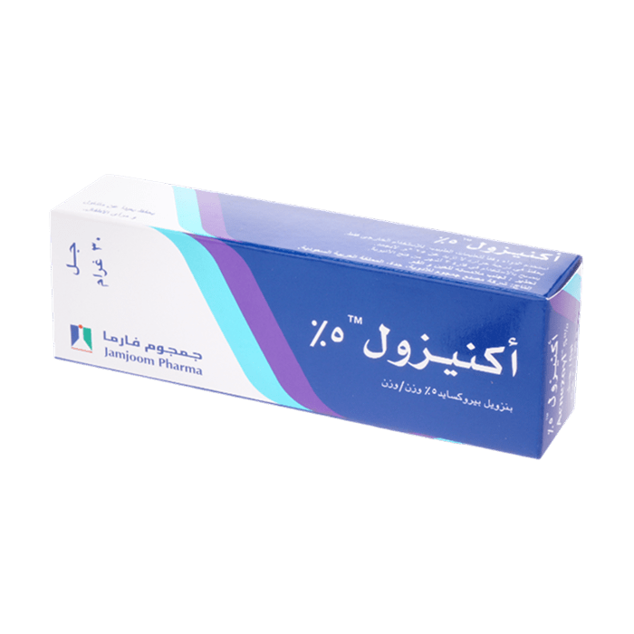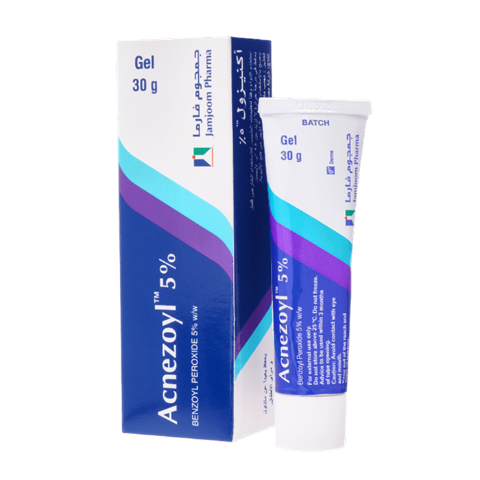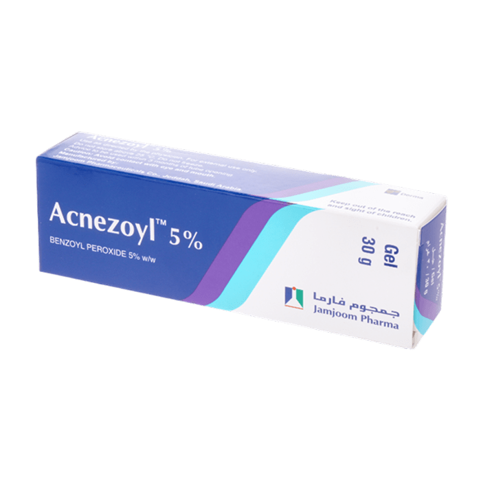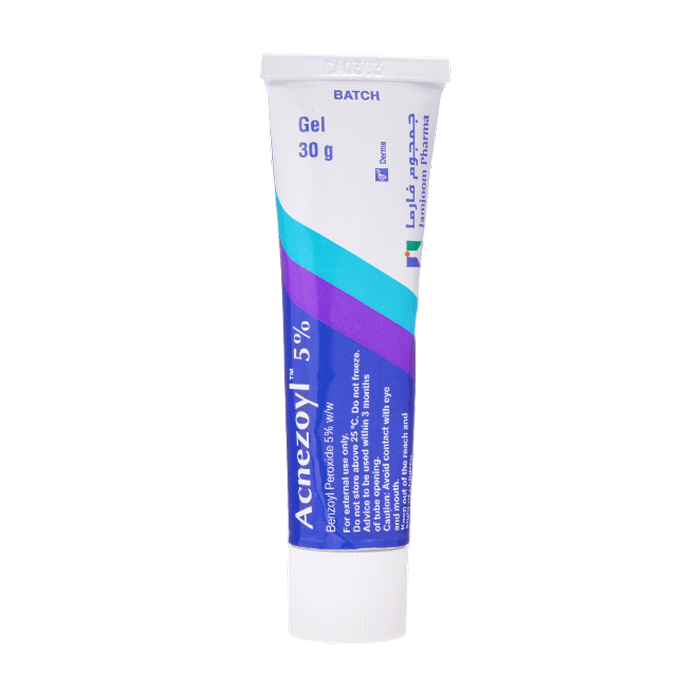 Benzoyl peroxide 5% w/w / This is an antibacterial and keratolytic agent used to treat acne (on face, chest, and back) by killing acne-causing bacteria and reducing clogged pores.